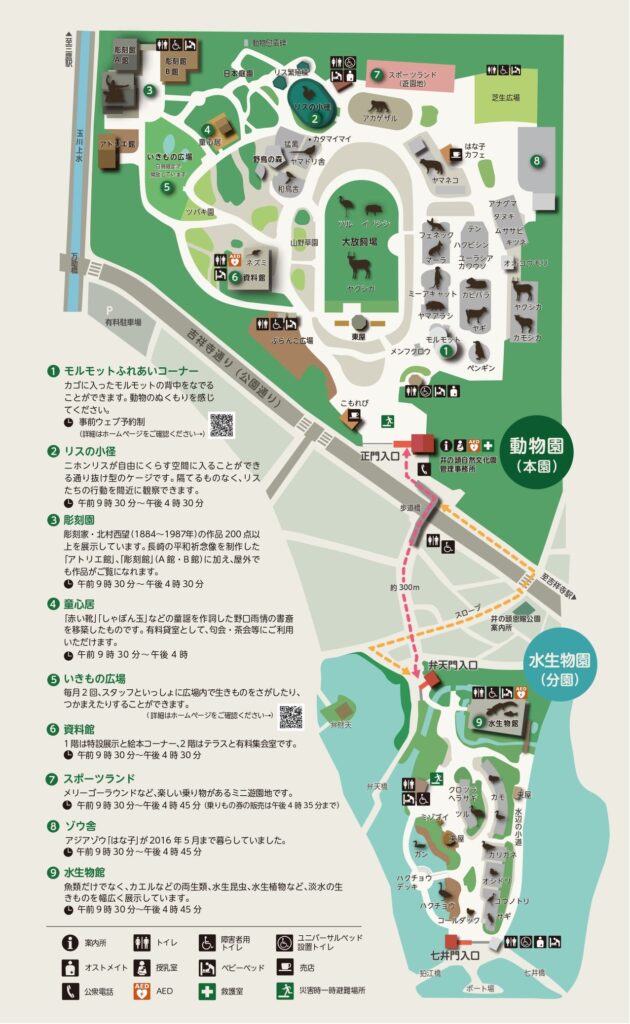 こちらは井の頭恩賜公園の北西辺りに位置しており、北側の動物園(本園)と南側の水生物園(分園)に分かれています。