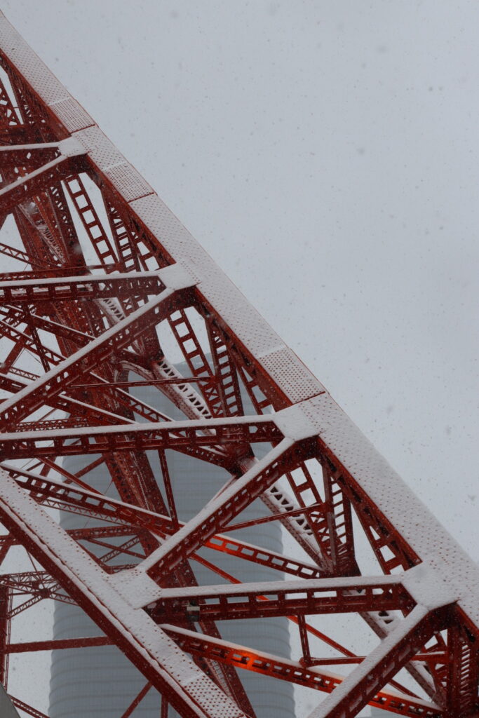 東京タワーの足元に来ました。脚にも雪が積もってます